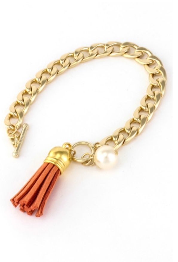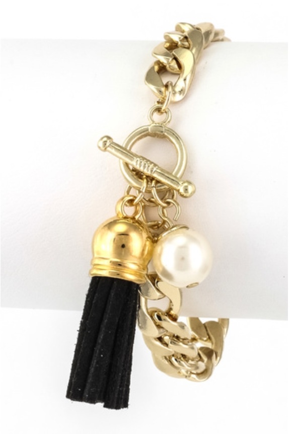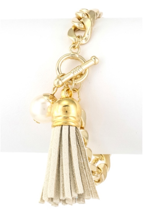 Metal chain link brush bell bracelet with pearl and tassel detail. - Length: 7" - Toggle closure
