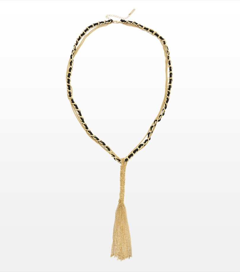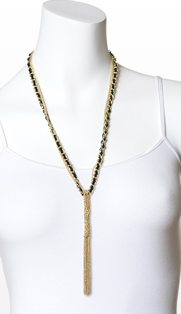Faux leather rope necklace with gold toned chains and tassel.