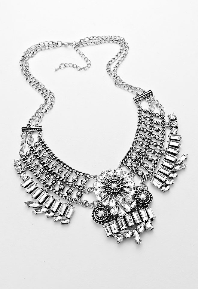 Aged finish bohemian style bib crystal lucite stone layered necklace and earring set. - Light weight - Length: Approx 18" with 3" extension - Lobster clasp closure - Post back stud earrings