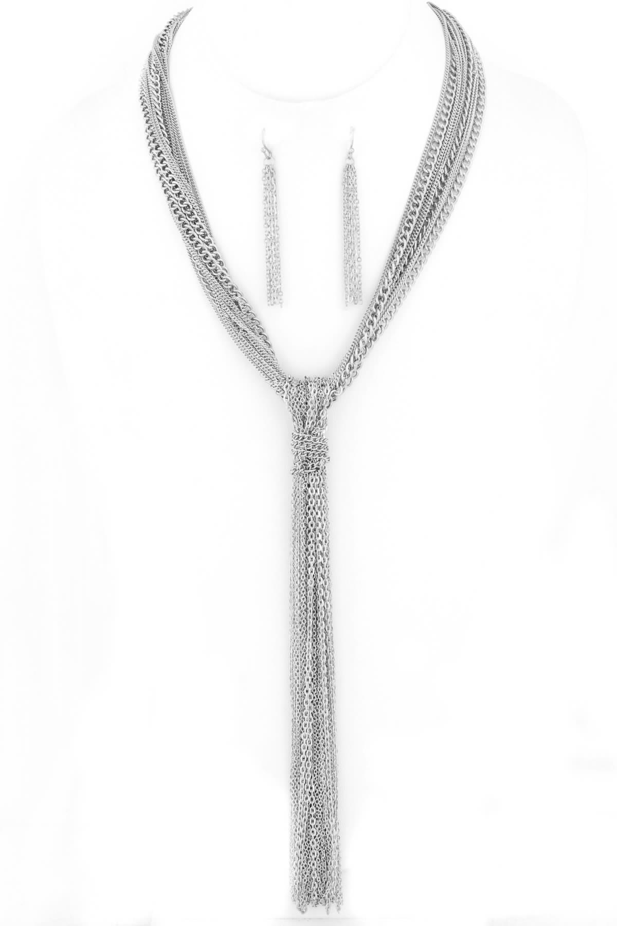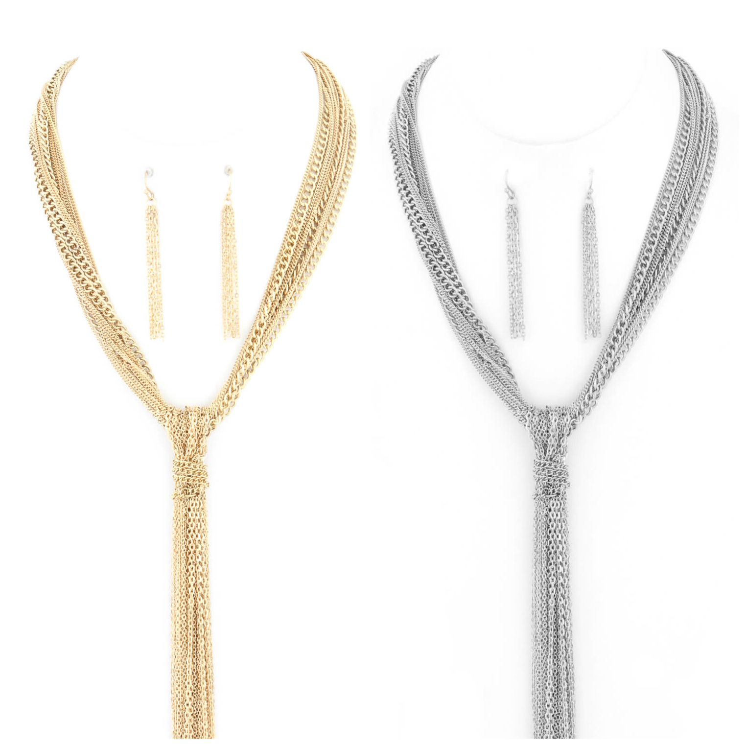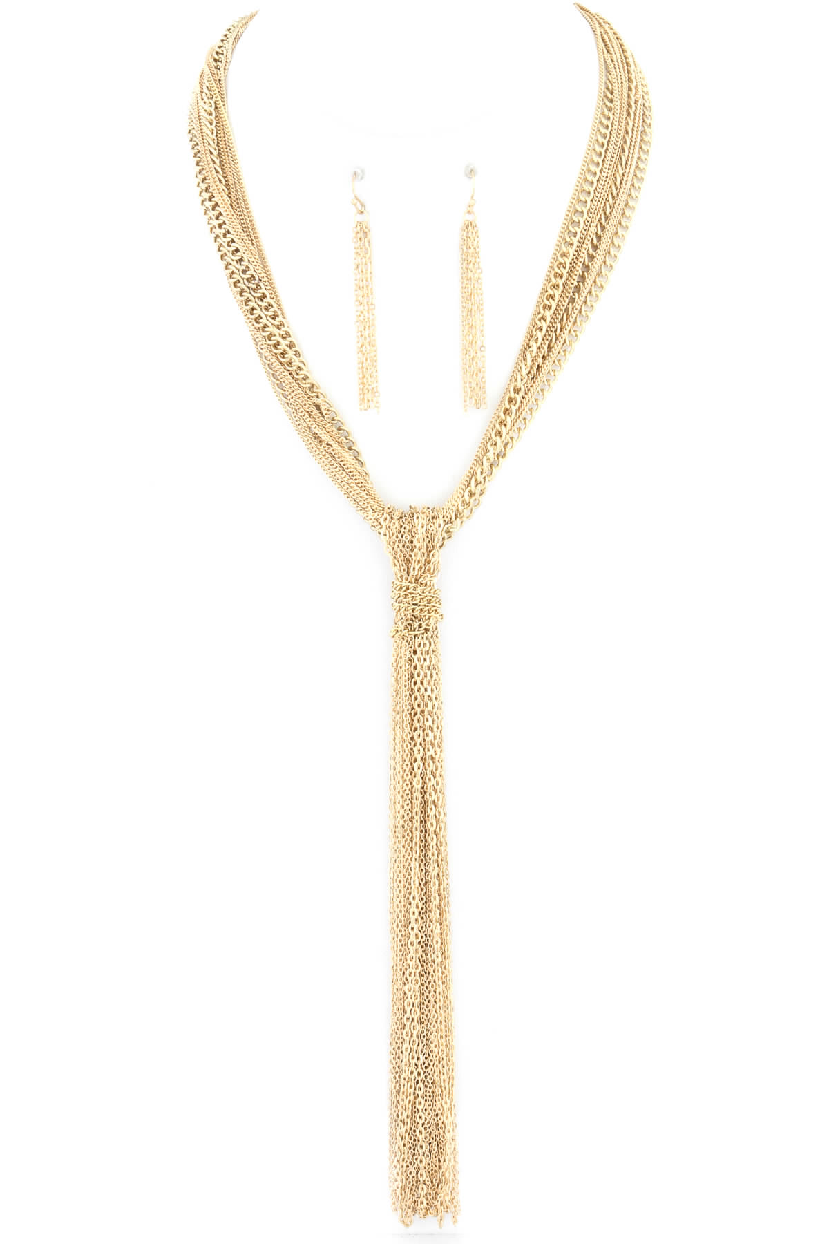 Multilayer chain link necklace set. - Length: 16.5" + 3" extension - Lobster clasp closure - Drop earring: 2.5" - Fish hook earrings