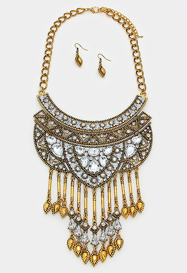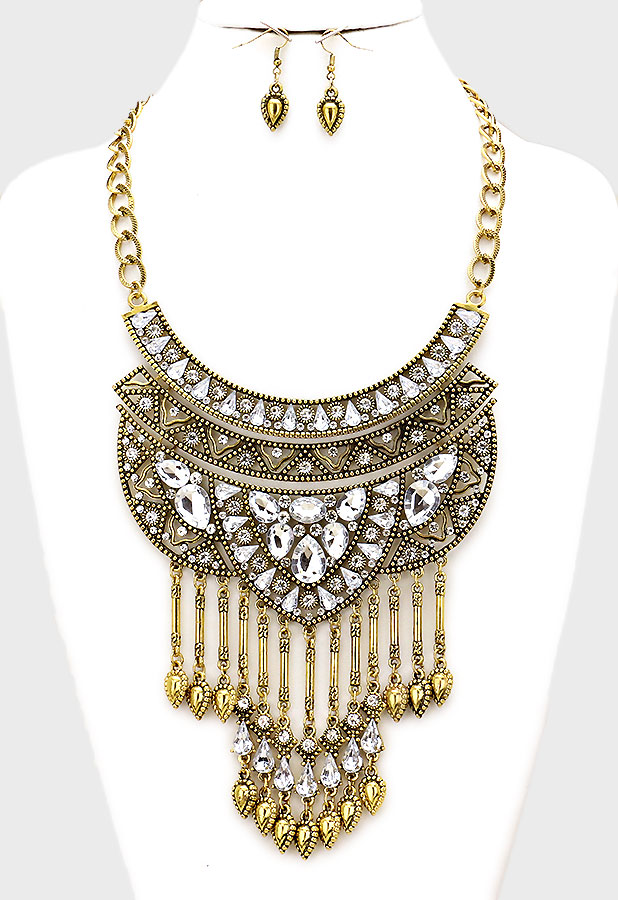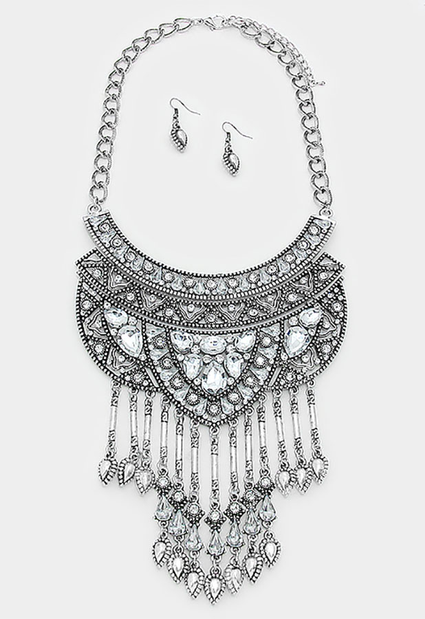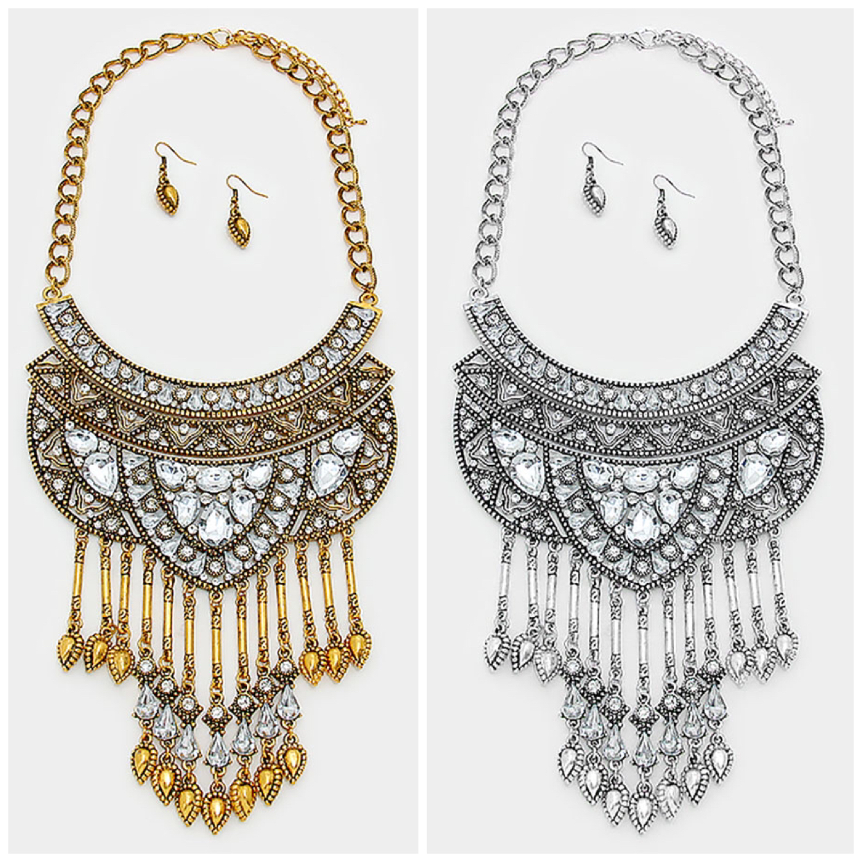 Tribal fringe crystal bib necklace set. - Length: Approx 21", 3" extension - Lobster clasp closure - Hook earrings; 1.5" L