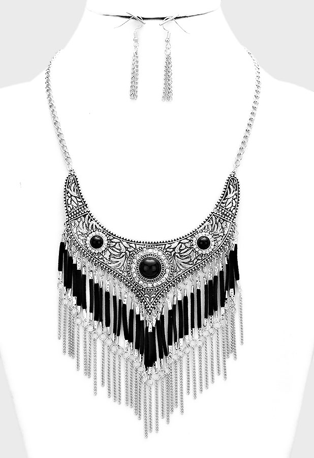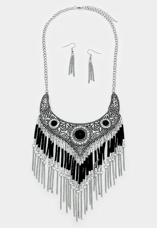 Tribal faux suede fringe necklace set. - Length: Approx 21", 2" extension - Lobster clasp closure - Hook earrings; 2" L
