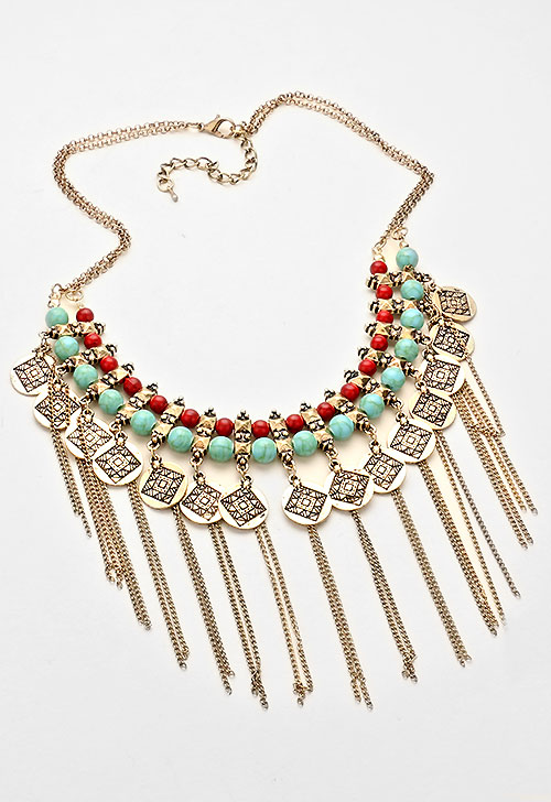 Bohomian style turquoise and coral tribal fringe necklace set. - Necklace Length: Approx 18", 3" extension - Decor length: 3.75" - Lobster clasp closure - Hook earrings length: 4"