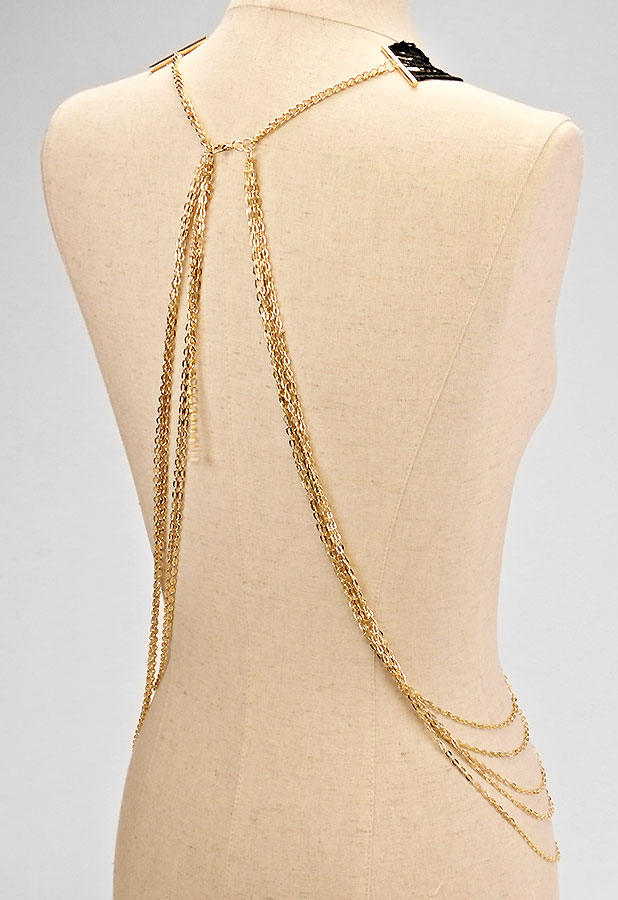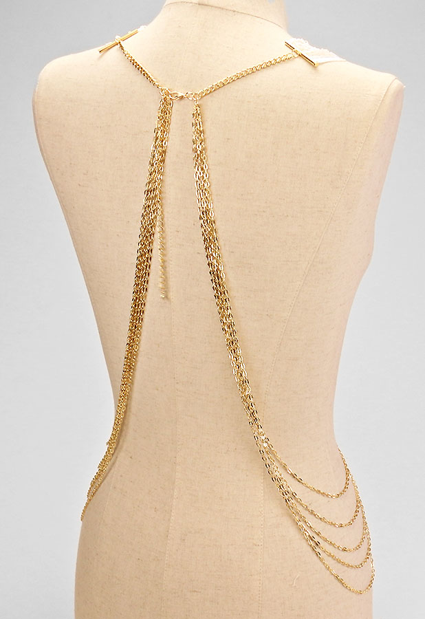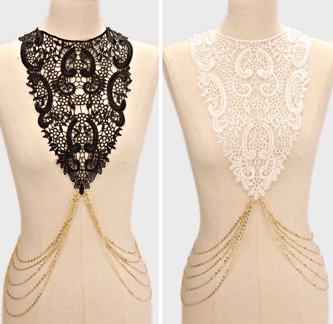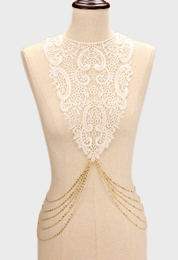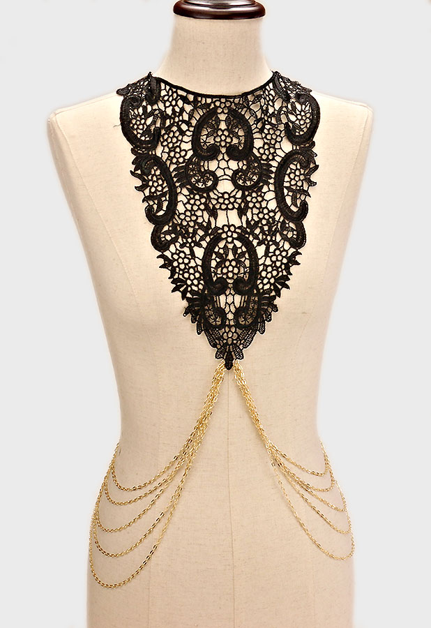 Floral lace and gold body chain. - Necklace: 18" + 7" length - Lace panel: 21" - Lobster clasp closure