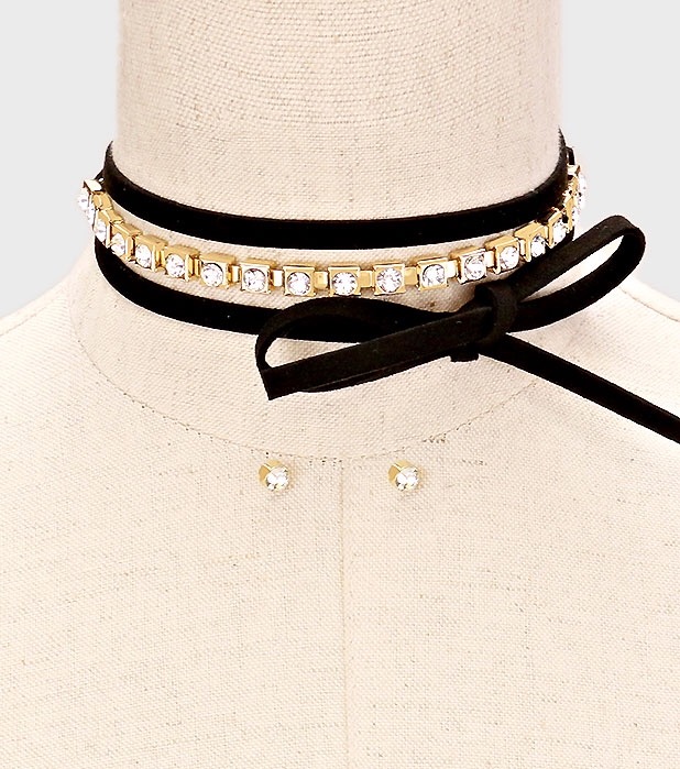 Faux suede tie choker necklace with crystal petals. - Length: 70" - Decor: 9" x 0.6" - Earrings: 0.2" length