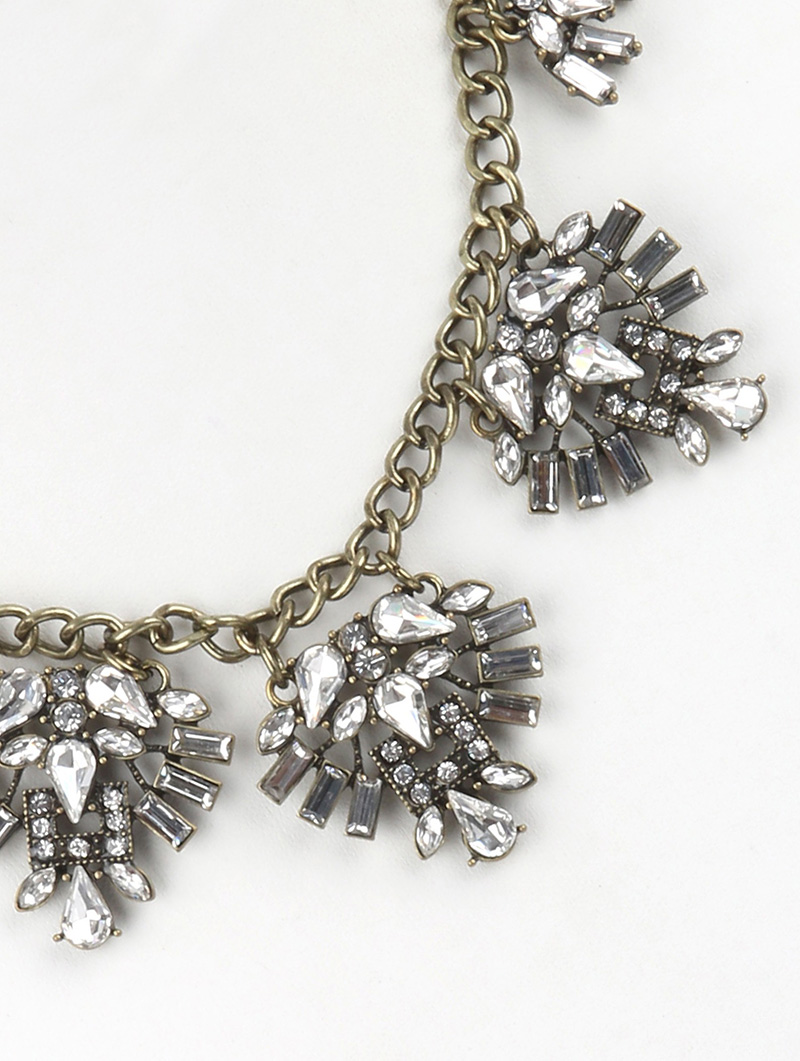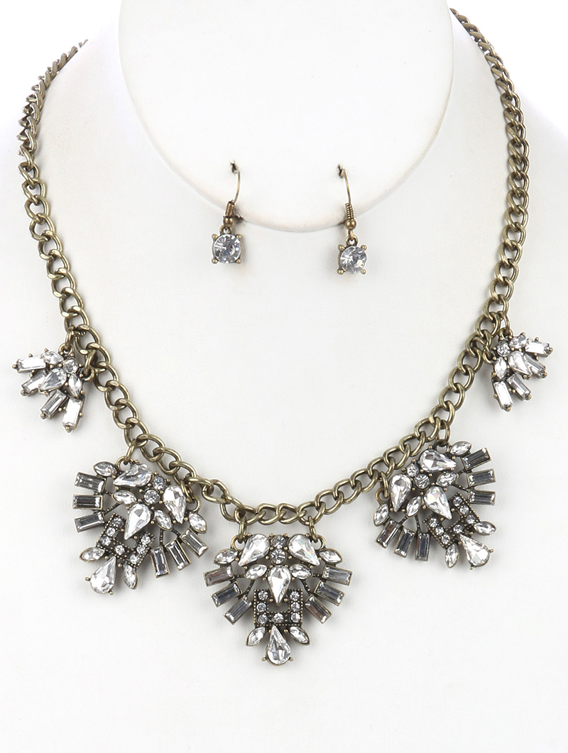 Aged finish crystal bib necklace and earring set. - 16" length; 1" drop - Lobster clasp closure - Fish hook earrings