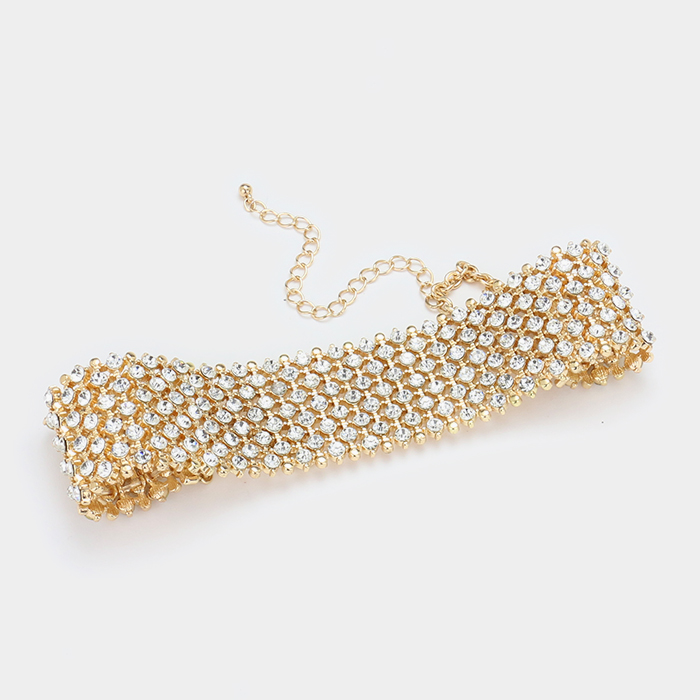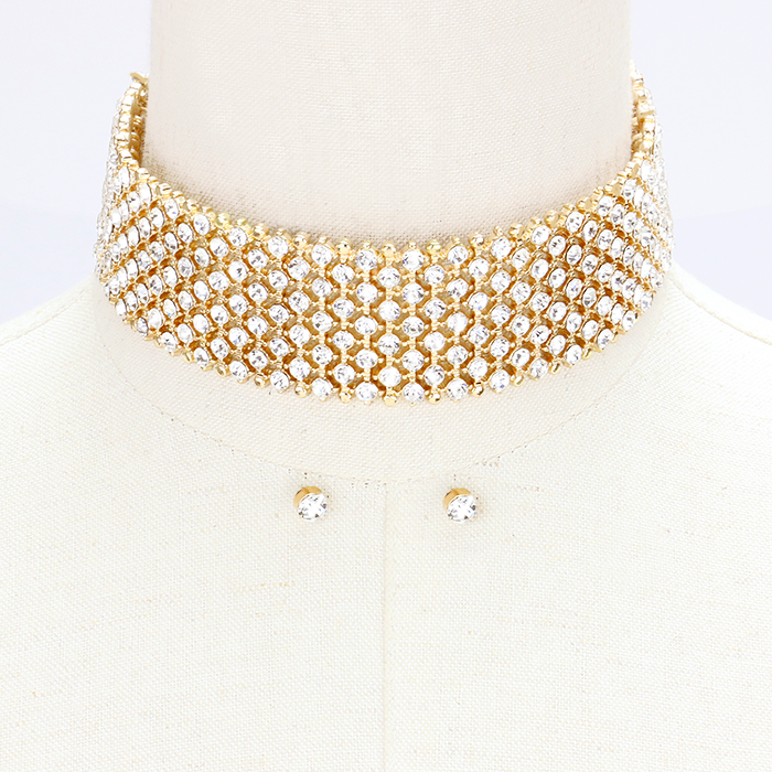 Crystal metal choker necklace and earrings. - Stretchable - Necklace: 13" + 4" ext - Post back stud earrings