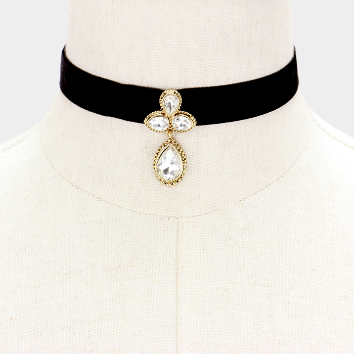 Velvet choker necklace with antique gold crystal teardrop pendant. • Necklace: 12" + 3" L • Pendant: 1.5" L