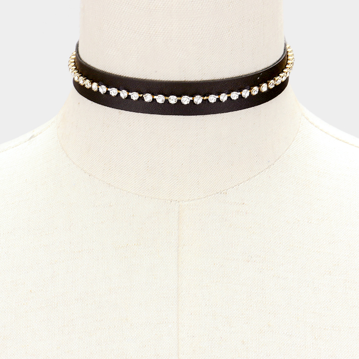 Crystal lined faux leather choker necklace. - Length: 11" + 3" - Width: 0.6"