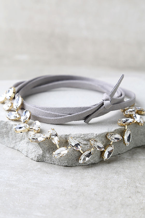 Faux suede tie choker necklace with crystal petals. - Length: 70" - Decor: 9" x 0.6"