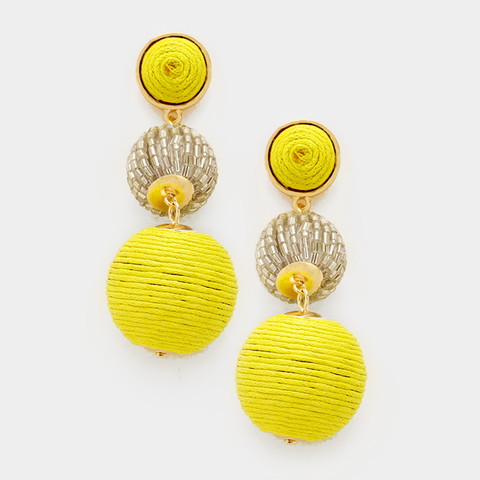 Thread and glass bead ball earrings. - 1" x 3" - Post back