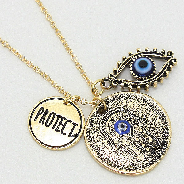 Antique gold Hamsa protection pendant necklace. • Length: 18" + 3” ext • Pendant Size : 1" X 1”