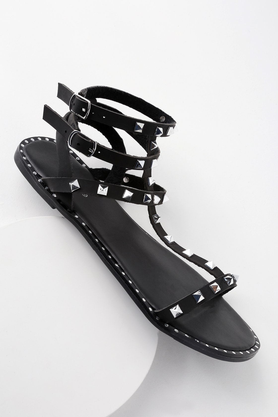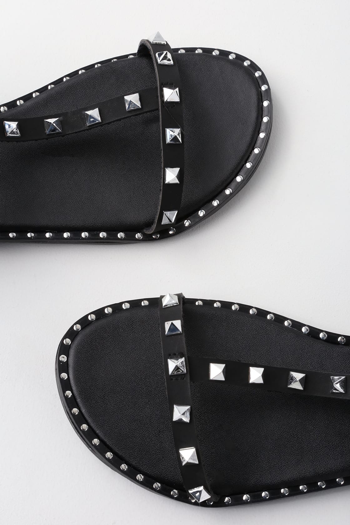 Designer inspired gladiator sandals with two adjustable ankle straps and silver studs. • 0.25" rubber heel • Lightly cushioned insole • Vegan