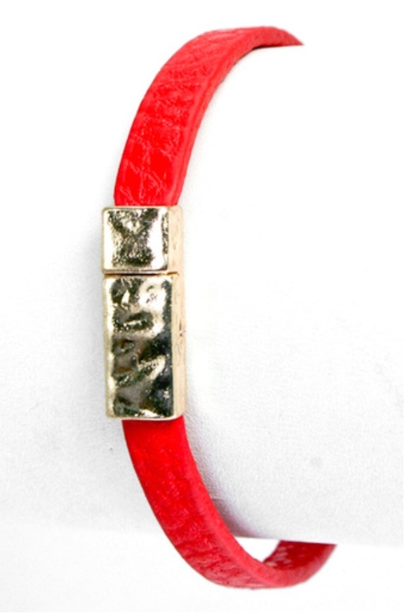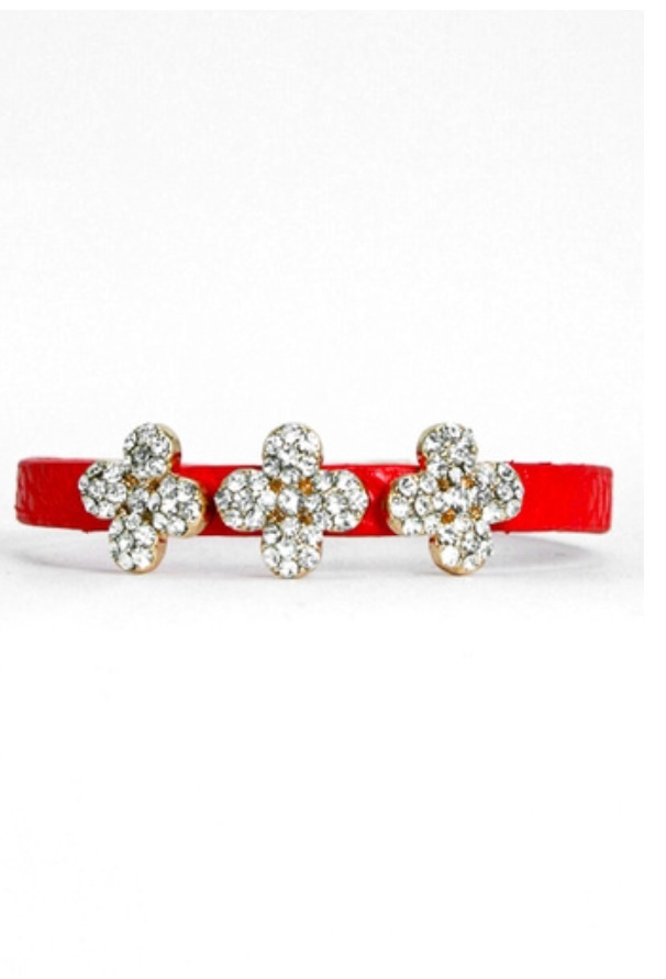 Faux leather bracelet with 3 crystal clover charms. - Length 7" - Width .25" - Magnetic clasp closure