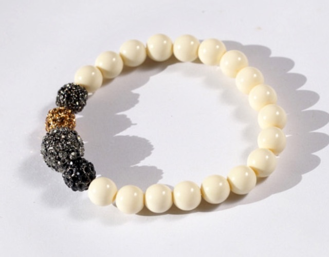 Classic cream beads and multicoloured pave crystal balls on a stretch bracelet.