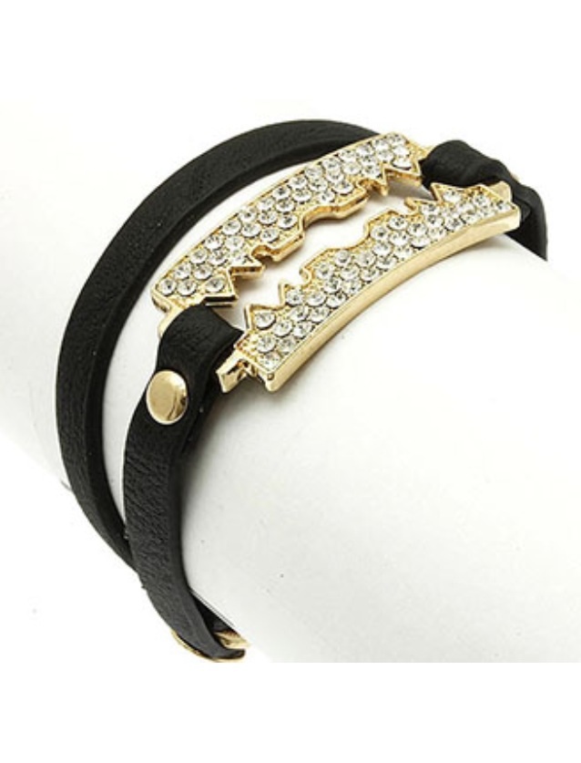 Faux leather wrap bracelet with crystal encrusted razor detail. - Bracelet length: 15" - Razor width: 0.75 "