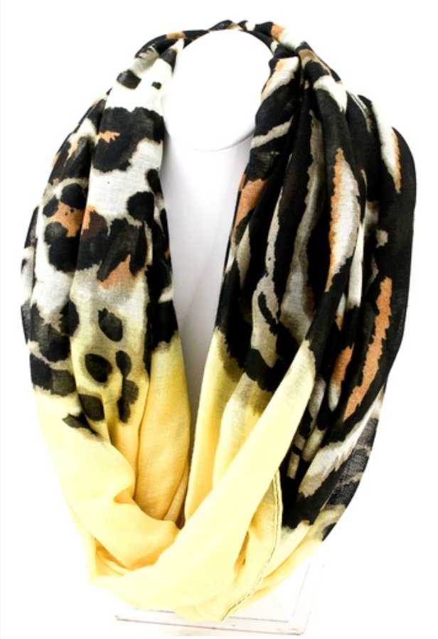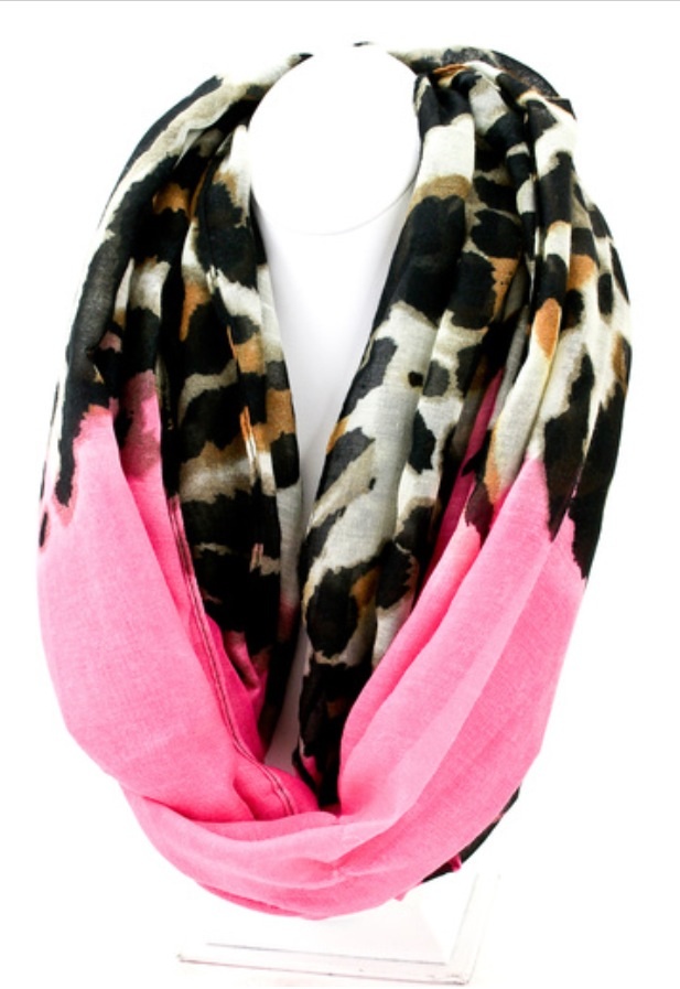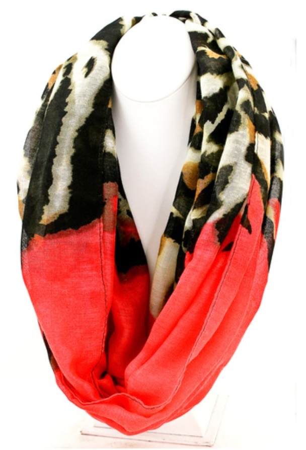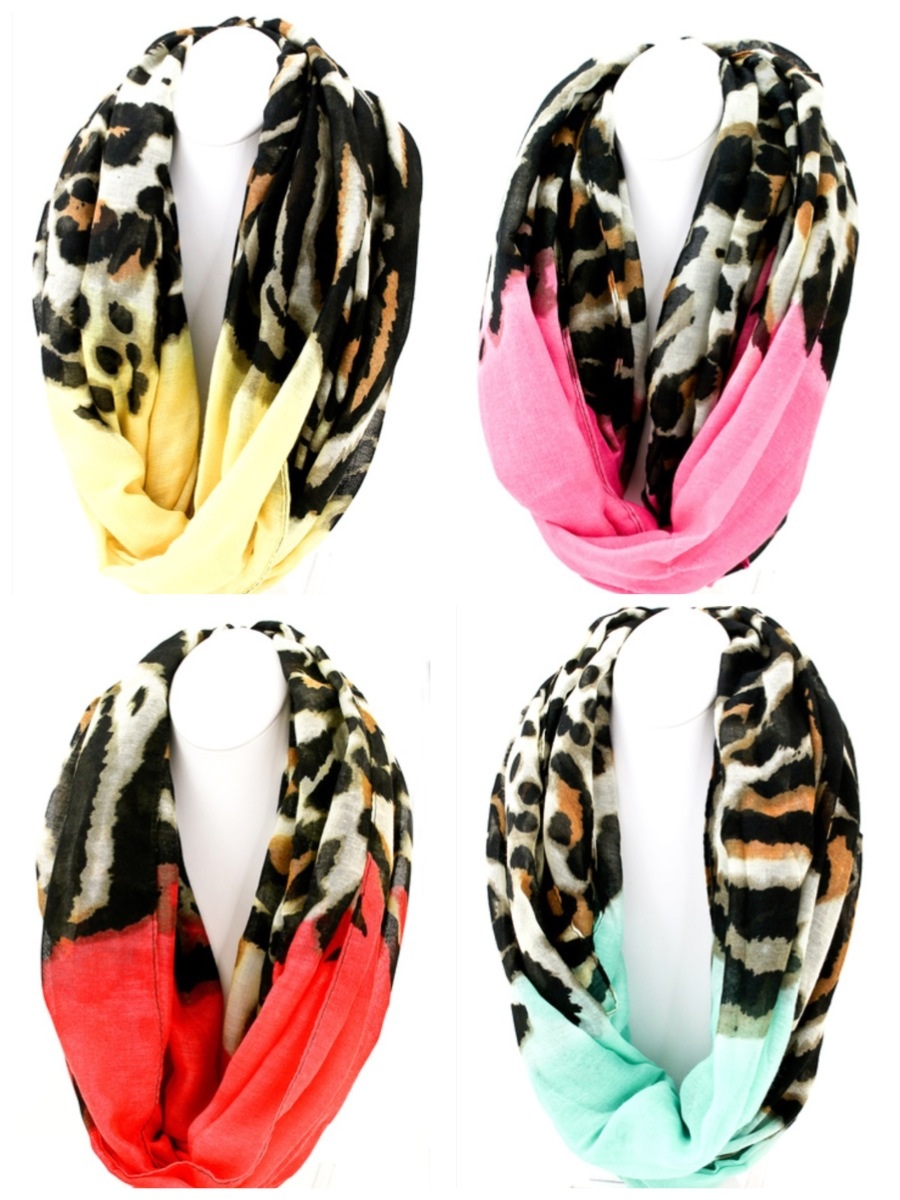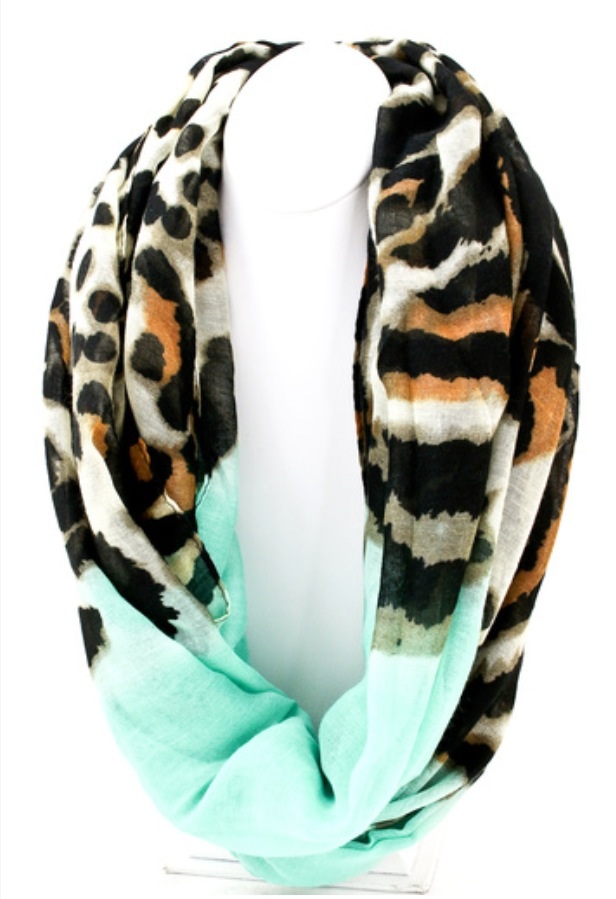 Woven leopard print and color block infinity scarf - 70" inner circumference x 28" width - 100% polyester