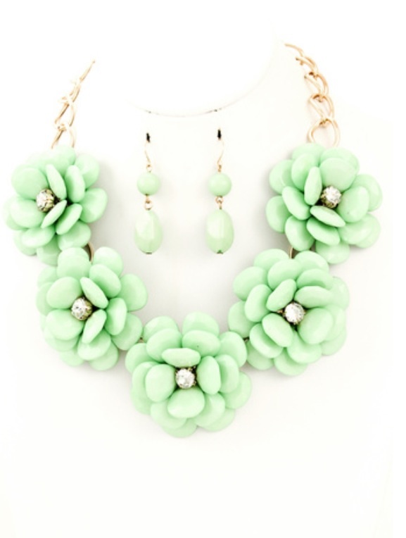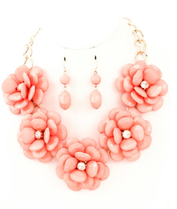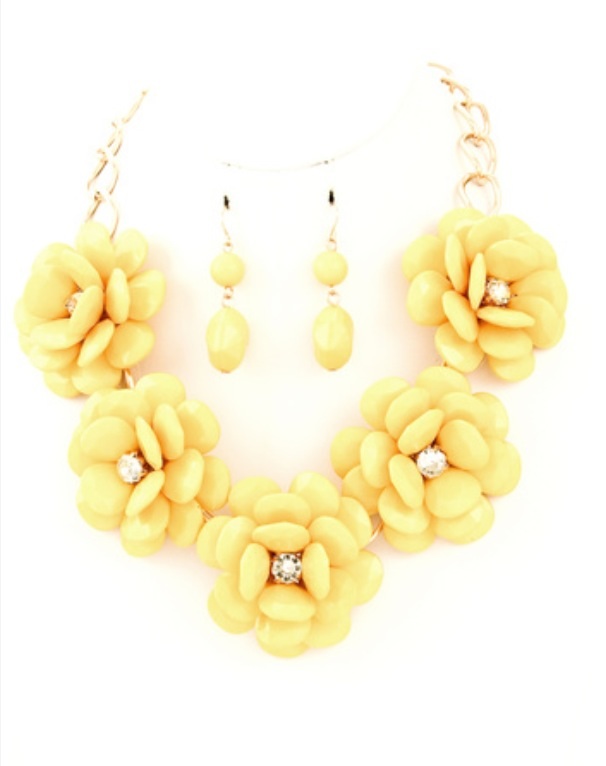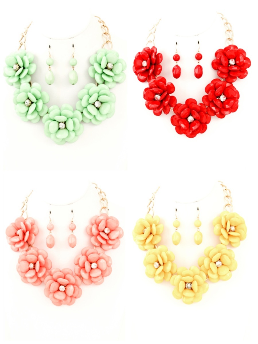 Acrylic flower necklace and earrings set. - Necklace length: 18" + 3" extension - Earring length: 1 3/4" - Fish hook earrings